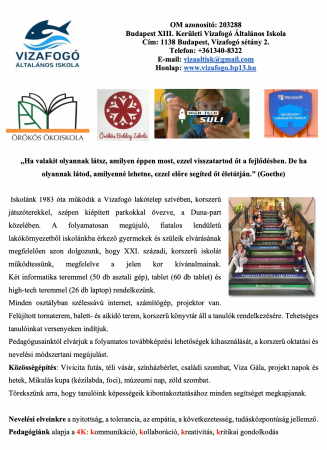 Iskolánk 1983 óta működik a Vizafogó lakótelep szívében, korszerű játszóterekkel, szépen kiépített parkokkal övezve, a Duna-part közelében.A folyamatosan megújuló, fiatalos lendületű lakókörnyezetből iskolánkba érkező gyermekek és szüleik elvárásának megfelelően azon dolgozunk, hogy XXI. századi, korszerű iskolát működtessünk, megfelelve a jelen kor igényeinek. Két informatika teremmel (50 db asztali gép), tablet (60 db tablet) és hight tech teremmel (26 db laptop) rendelkezünk.